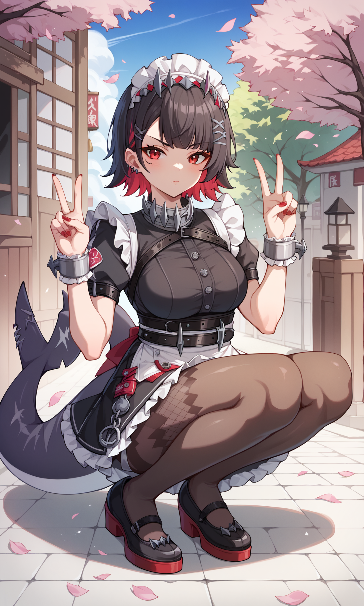 服装:女仆头饰,发饰,黑色连衣裙,蓬松短袖,项圈,荷叶边连衣裙,高腰裙,黑色连裤袜,手腕袖扣,围裙,腰带,黑色鞋履