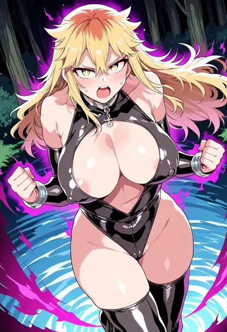 ((沉重的钢制项圈,悬挂维纳斯符号吊坠,性感露骨黑色乳胶紧身衣,心形胸膛开衩,遮盖乳头,性感黑色乳胶连裤袜带金属边缘,性感黑色乳胶臂套,金属手环,))
