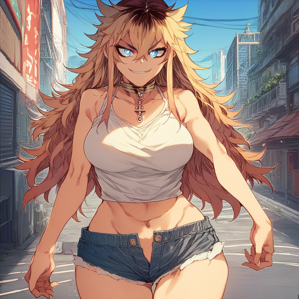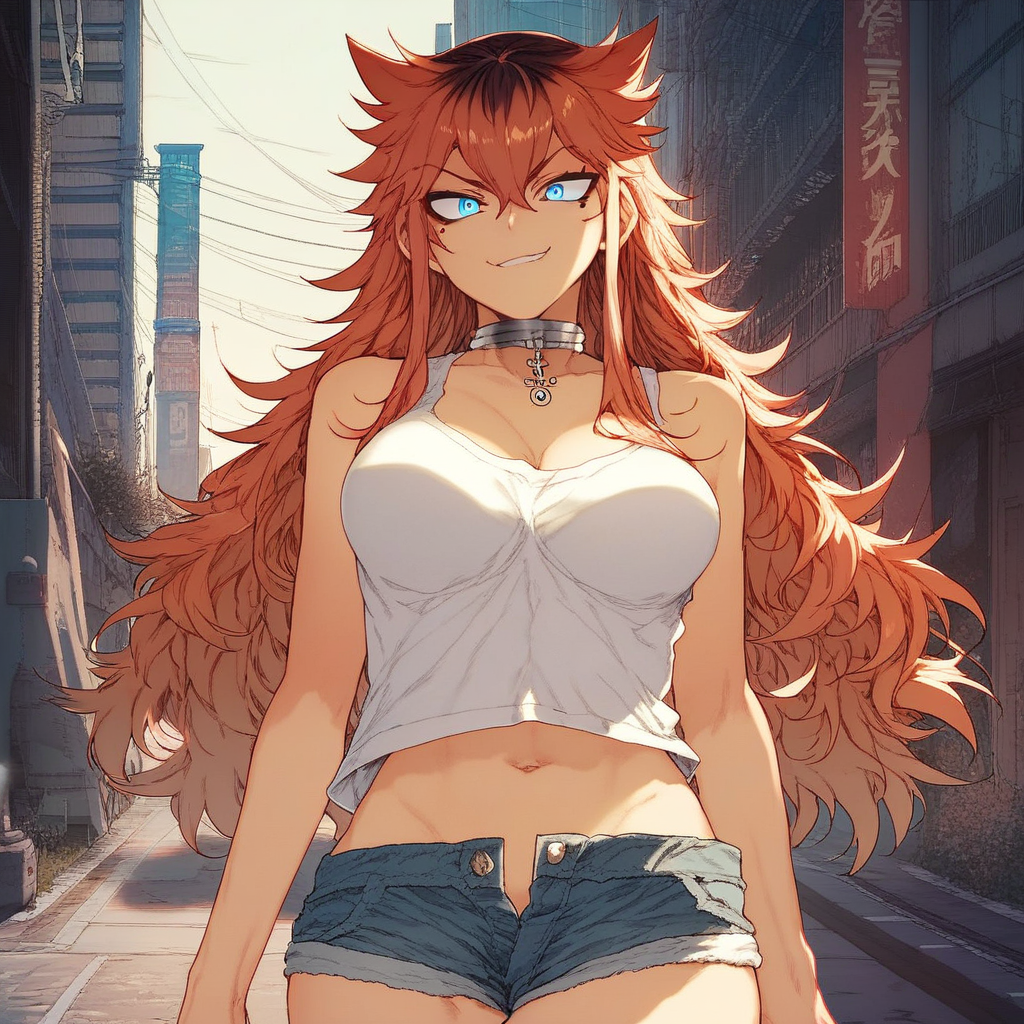 1c. ((비너스 문양 펜던트가 달린 무거운 스틸 목걸이, 섹시한 어깨 드러난 흰색 상의, 허리 노출, 끝이 헤어진 초단축 청바지, 빨간 타이트하이, 빨간 날카로운 팔찌, )) 검은 부츠,