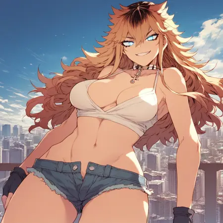1c. ((沉重的钢制项圈,悬挂维纳斯符号吊坠,性感无袖白色上衣,露脐,边缘破洞的超短牛仔短裤,红色连裤袜,红色尖刺手环,))黑色靴子,