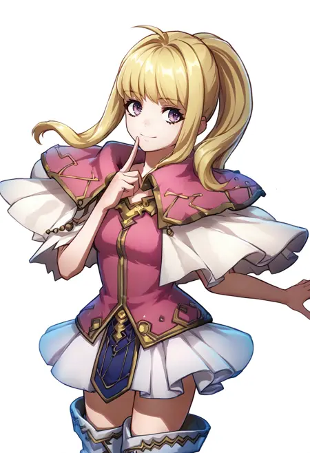 Cipher appearance: altClarine, long hair, ponytail, sidelocks, pink shirt, capelet, neck ribbon, frilled skirt, white gloves, black thighhighs, white thigh boots