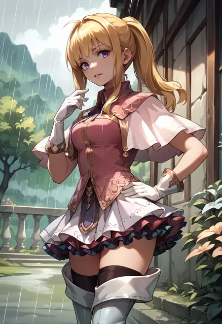 デフォルトの外観: defClarine、長い髪、ポニーテール、サイドロックス、ピンクのシャツ、カーペット、白いスカート、白い太ももブーツ、脚のアーマー