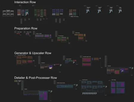 This is why I split the workflows pipeline into 14 separate sections. Every section is labeled with its task and tries to be as comprehensible as possible. In addition, I added 4 extra sections to control everything about the pipeline. That way you don't have to search for the specific place to enable or disable elements of the pipeline and can stay in just the area for control. For adjustment of specific nodes, manual adjustments are still required though.