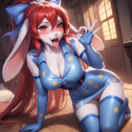 她的服装标签:大型蓝色蝴蝶结、短款蓝色乳胶连衣裙、星星图案:0.6、蓝色乳胶长筒袜、长款蓝色乳胶手套