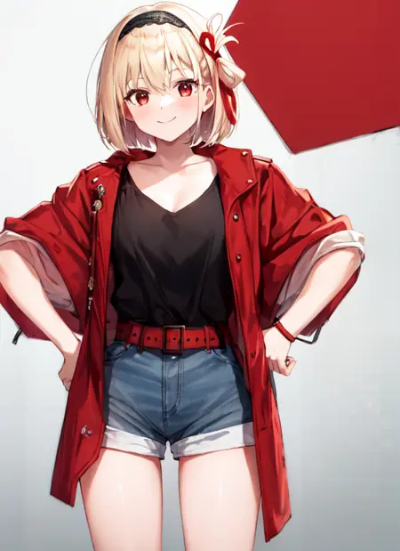 私服(外出): 短裤,衬衫,发带,白色短裤,黑色衬衫,腰带,黑色发带,红色夹克,敞开穿的衣物,锁骨,短袖,夹克,超短裤,红腰带,红外套,大腿,发饰,
