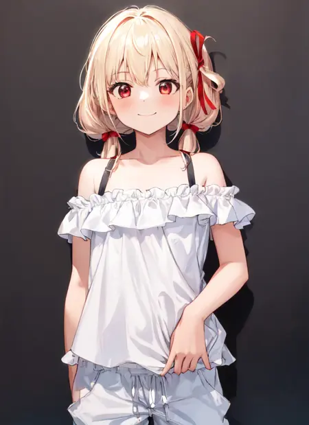 私服(室内): 蕾丝衬衫,衬衫,双马尾,白衬衫,褶边,白色长裤,长裤,锁骨,无袖上衣,露肩,短双马尾,睡衣,露肩,