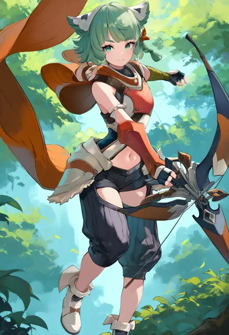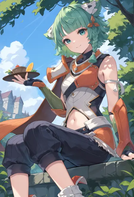 标签(服装):绿色露指手套,白色胸甲,橙色斗篷,黑色短裤,橙色前臂护甲
