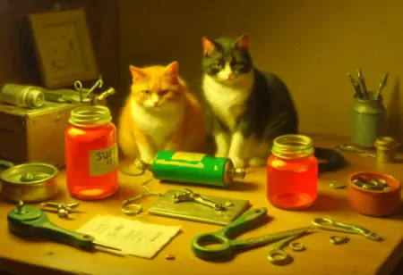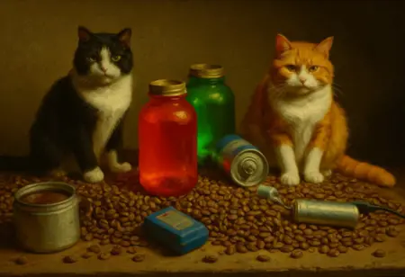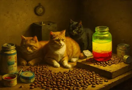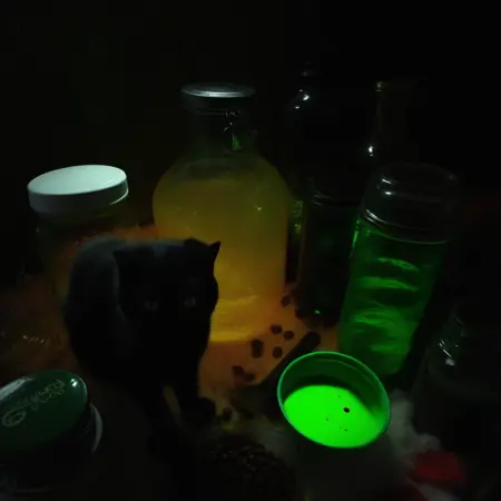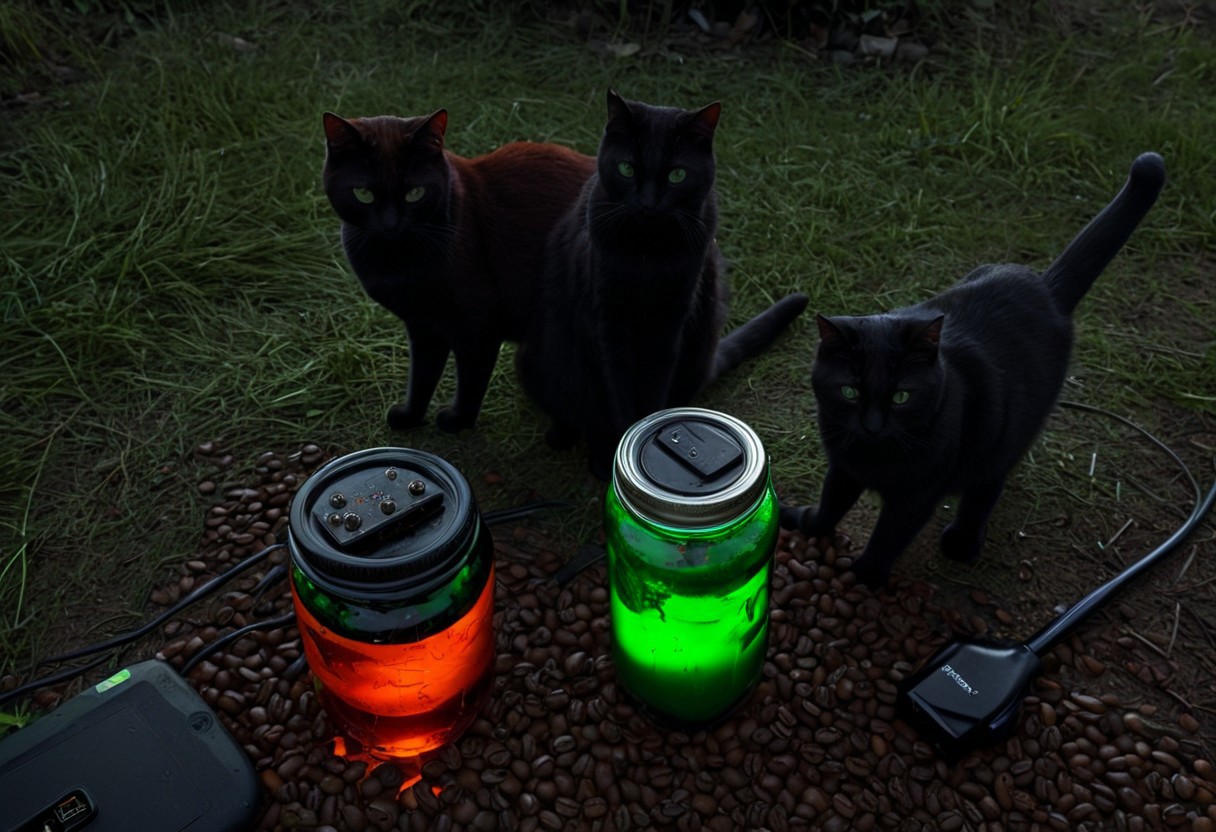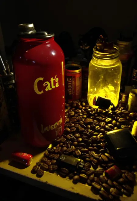 黑猫,橘猫,杂乱,垃圾,车库,玻璃瓶,绿色粘液,电子产品,充电器,18650,玻璃罐,红色液体,斧头,木头,碎片,咖啡豆,逆光,低调