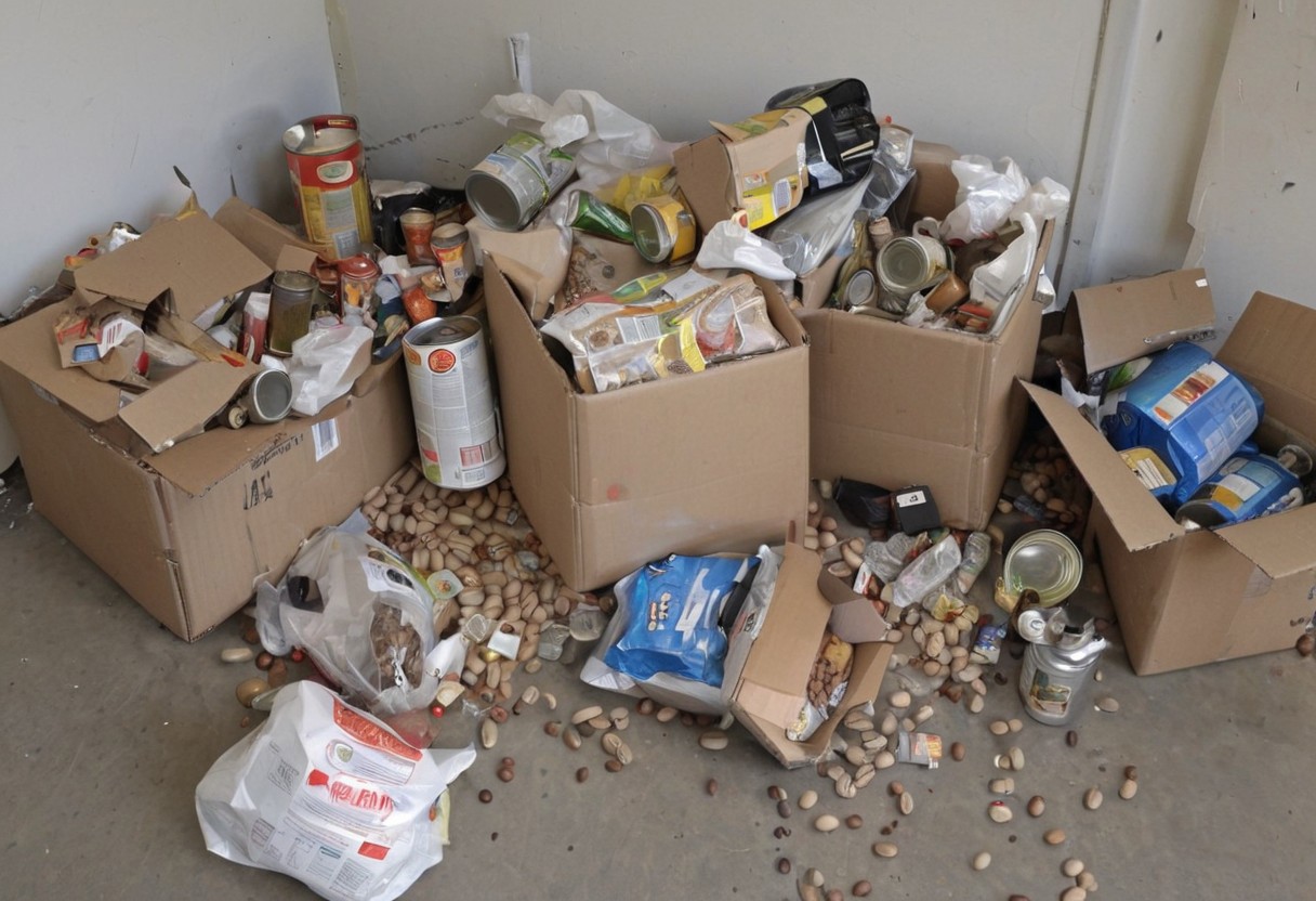 杂乱,垃圾,玻璃瓶,工具,咖啡豆,电子产品,罐头食品,瓶子,一堆罐头,塑料袋,纸箱,杂乱,垃圾,凌乱储存,各种物品,细节丰富,混凝土地板,死老鼠,肚皮朝上,