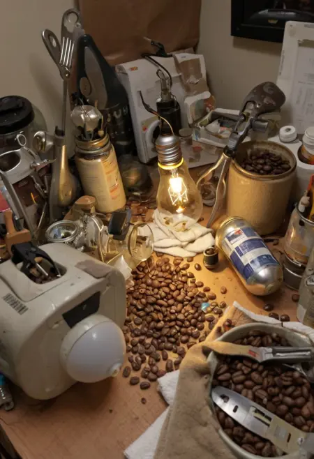 咖啡豆,橘猫,黑猫,杂乱,垃圾,凌乱的长凳,罐头,工具,电脑零件,电子设备,灯泡,电池充电器,电池,充电器,18650,电线,纸箱,随机物品,各种物件,杂乱储存,石墙,低调,聚光灯,