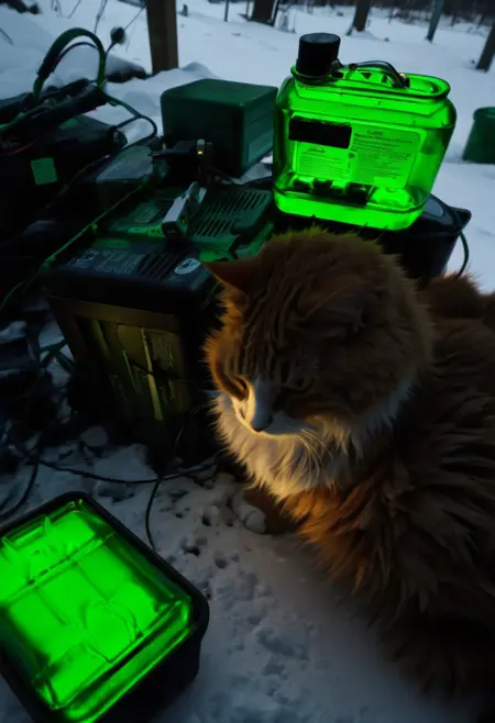 clutter, thrash, wires, garage, tools, coffee beans, battery, 18650, charger, electronics, cans, messy, messy workspace, messy storage, randomness, disorganized, random items, disorganized storage, various objects, plastic bags, pots, wood shavings, log, computer parts, debris, purple hoses, cable, plastic container, cardboard box, boxes labeled 'stuff', bucket, axe, kitchen, kitchen utensils, canned food, light bulbs, stone wall, plastic chairs, watering cans, buckets, plants, garden tools, outdoor, vines, pine needles, snow, cat, green goo, red goo, yellow goo, glass bottle, glass jars, backlit, dark, low key,