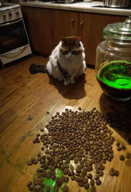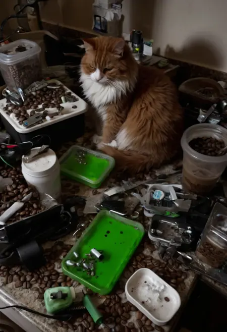 black cat, orange cat, clutter, trash, garage, glass bottle, green goo, electronics, charger, 18650, glass jar, red liquid, axe, log, debris, coffee beans, backlit, low key