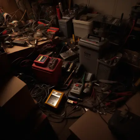 clutter, thrash, cluttered shed, boxes labeled 'stuff', tangled cables, tools, batteries, charger, 18650 randomness, various objects, wall painting, low key, spot lighting, BREAK glass jars, green liquid, green glass, glass bottle, red liquid, backlit, (BREAK is mostly for comical reasons, before glass here)