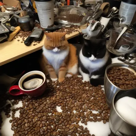 coffee beans, orange cat, black cat, clutter, trash, messy bench, cans, tools, computer parts, electronics, light bulbs, battery charger, batteries, charger, 18650, wires, cardboard boxes, random items, various objects, disorganized storage, stone wall, low key, spot lighting,