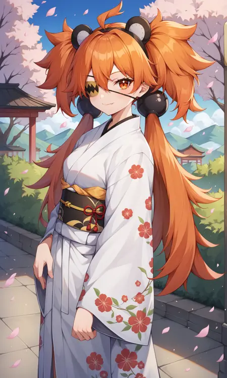 外观:科列达,橙色眼睛,眼罩,橙色头发,呆毛,长发,两侧上撩,低双马尾,黑色发球,发球装饰,假动物耳朵,金属项圈