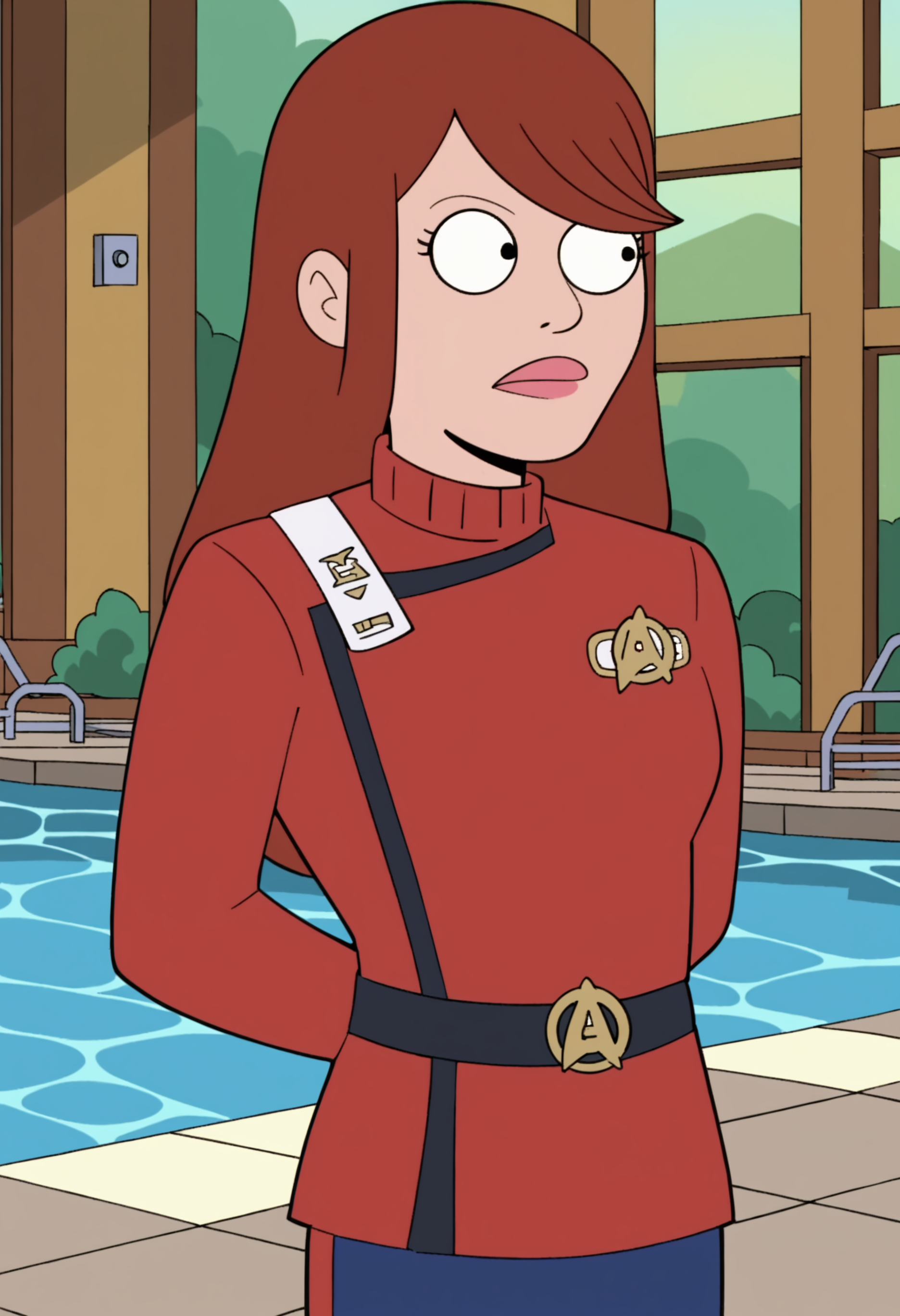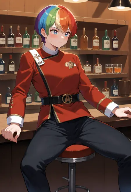 これはプロンプトを設定するのがやや難しいものの一つです。この場合、シンプルなプロンプトの方が良いです。基本的なトリガーは「twokunf,star trek red uniform,long sleeves,black belt」のようなものにしましょう。赤いズボンが生成されてしまう場合、「black pants」と追加すると良いことがあります。これはほとんどのケースで問題なく機能します。ストラップやカラーの色を追加することもできますが、これはしばしば問題を引き起こすことがあります。