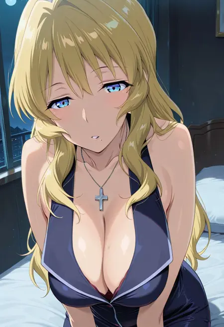 SLEEVELESS DRESS, CROSS NECKLACE, THIGHHIGHS,