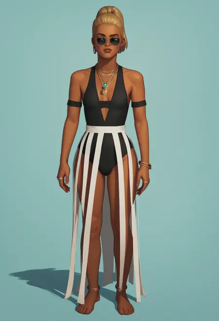 • 太阳镜, 耳环, 圆环耳环, 泳装, 一体式泳装, 黑色一体式泳装, 戒指, 手臂环, 项链