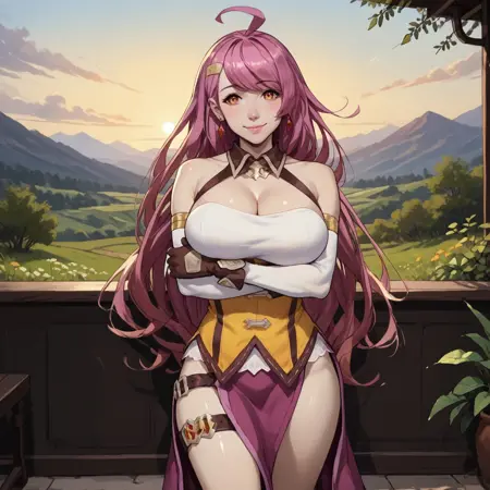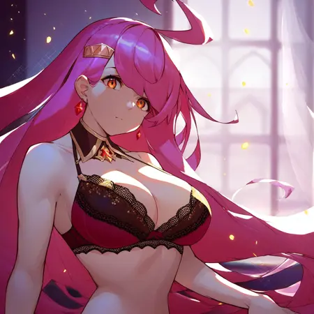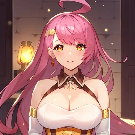 Trigger words: Rena dragalia, Pink hair, Orange eyes, ahoge, large breasts, earrings, hair ornament,