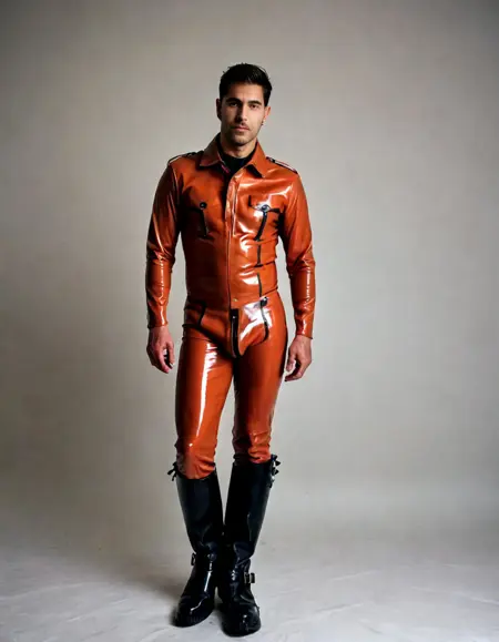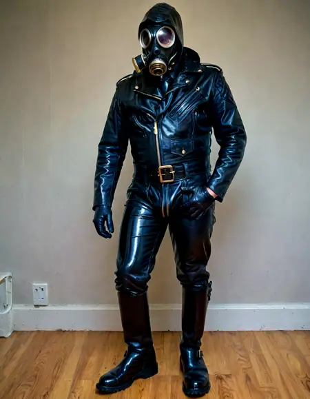 bodysuit,black footwear,shiny clothes,boots,latex,black bodysuit,leather,hood,gimp mask,mask,gloves,leather jacket,gas mask,male underwear,leather pants,sex toy,military,police uniform,