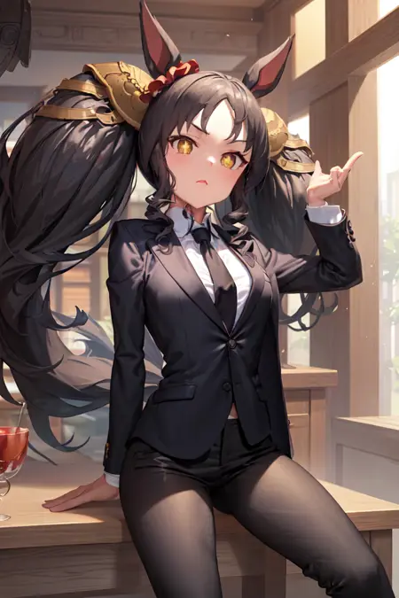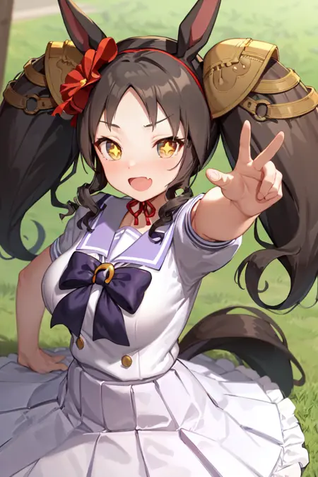- Tracen学校制服、夏服、セーラー服、ふわっとした短い袖、紫色のネクタイ、馬蹄の飾り、セーラー襟、セーラーシャツ、紫シャツ、白スカート、プリーツスカート、フリルスカート、ミニスカート、絶対領域、白いレース、茶色の靴、ローファー