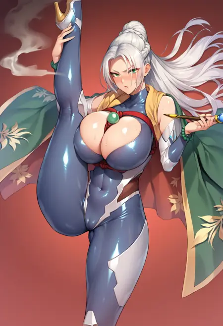lora:natsu_inage-10:1.0, 녹색 눈, 가슴 노출, 포니테일, 바디수트, 흰색 머리, 피부에 달라붙는, 하이힐, 반짝이는 옷, 분리된 소매, 갈라진 앞머리, 옷의 절개부, 바디수트, 터틀넥, 가슴 절개부, 피부에 달라붙는, 반짝이는 옷, 팔찌, 클라비클의 빨간 끈, 가슴 사이의 빨간 끈, 끈에 있는 녹색 진주, (하이힐:0.8)