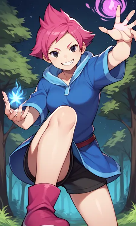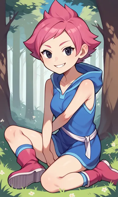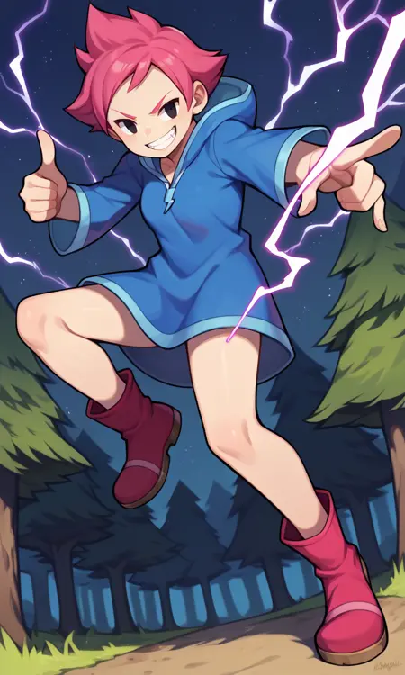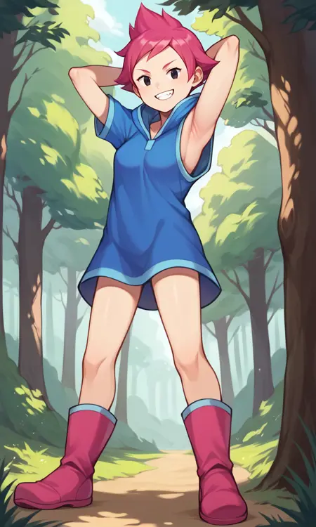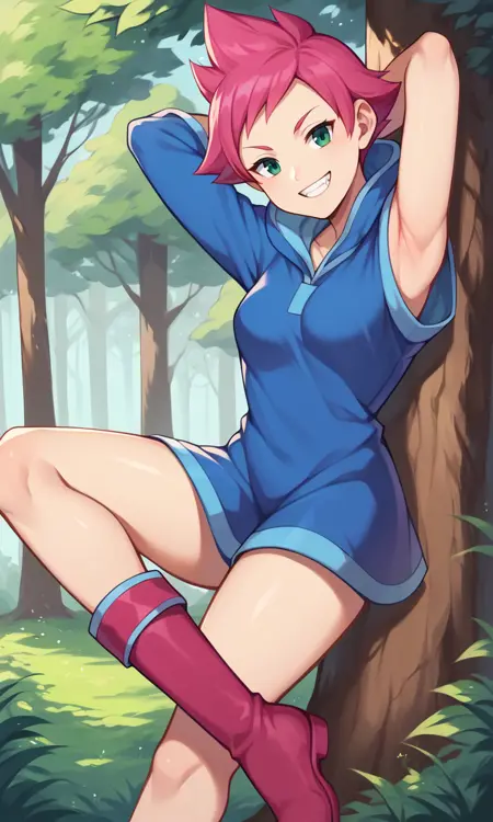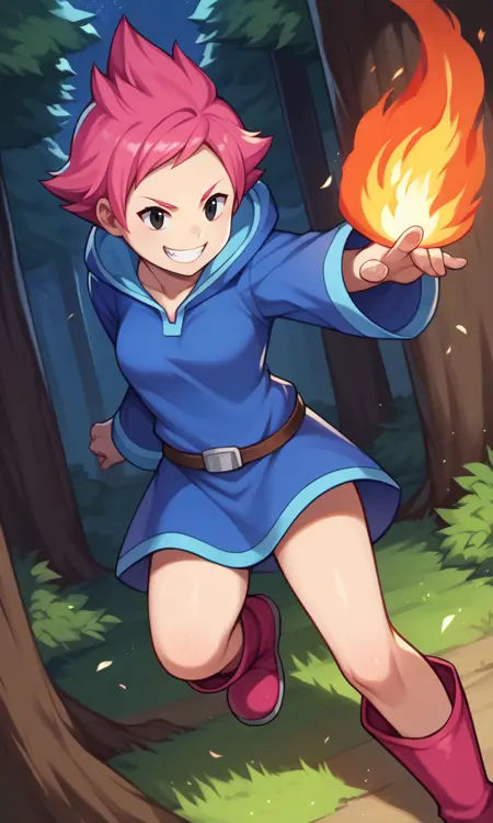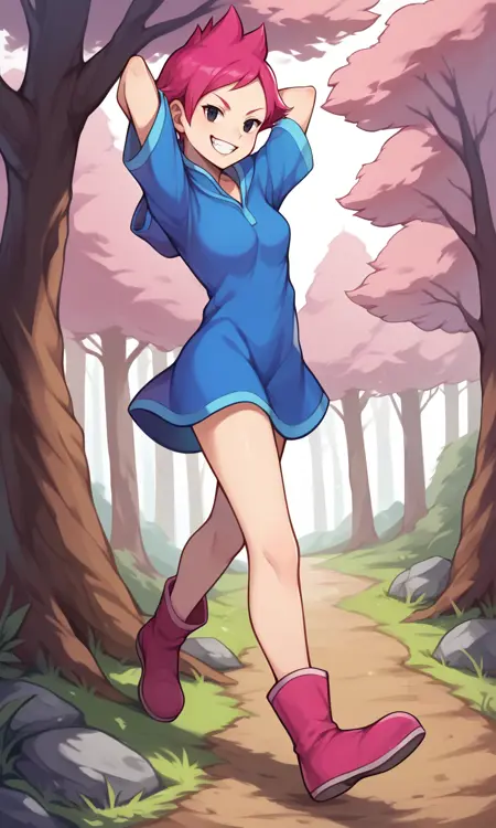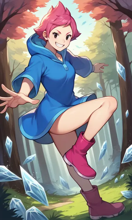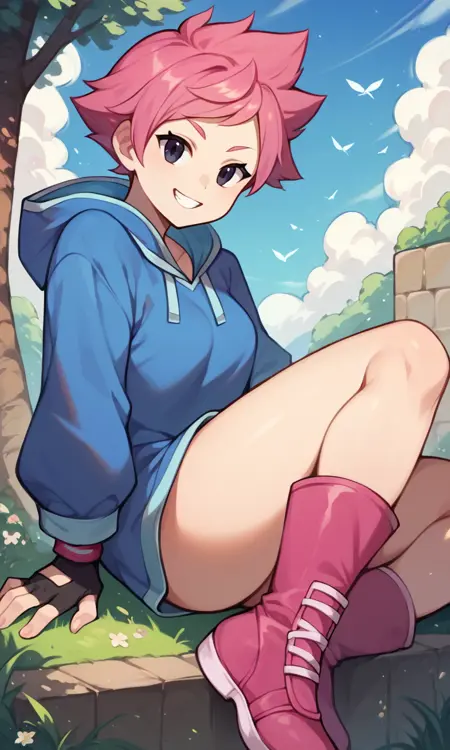 score_9, score_8_up, score_7_up, score_6_up, score_5_up, score_4_up, Kumatora, pink hair, black eyes, blue hooded dress, short hair, tomboy, pink boots, fingerless gloves, thighs