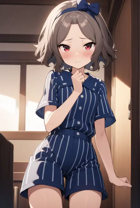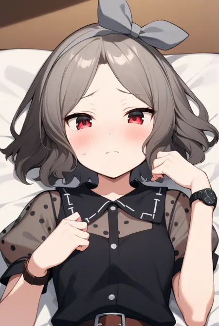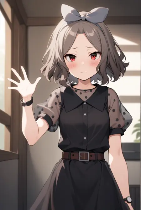 GBC_TOMO,1girl,solo,red eyes,short hair,wavy hair,brown hair,