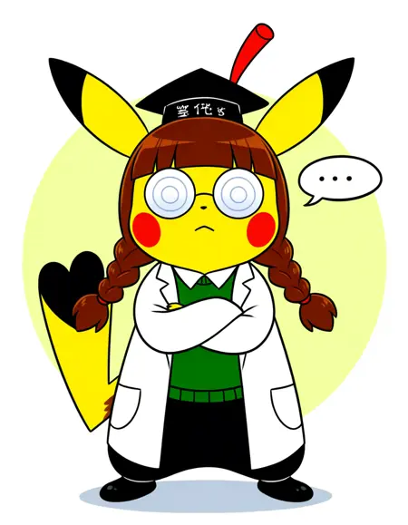 博士号: pikaphd, lab coat, collared shirt, green sweater, brown hair, blunt bangs, twin braids, black pants, black footwear, glasses, round eyewear, pocket, coke-bottle glasses, opaque glasses, graduation cap