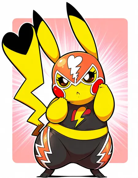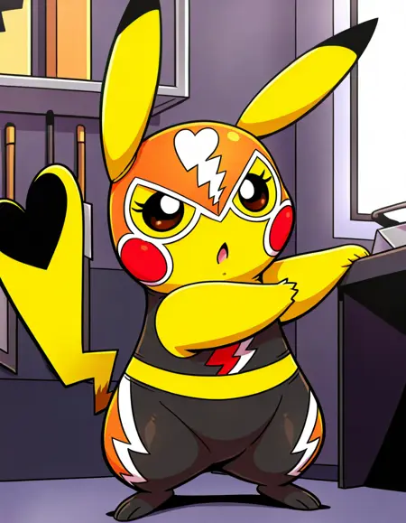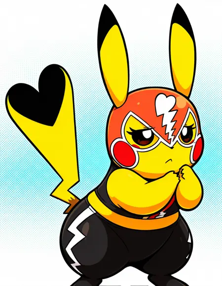 リブレ: pikalibre, midriff, leggings, wrestling mask, black shirt, lightning bolt symbol, sleeveless shirt, wrestling shirt, heart, patterned legwear
