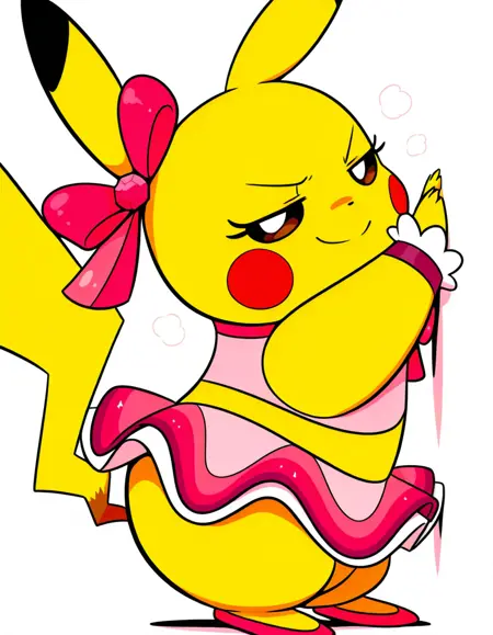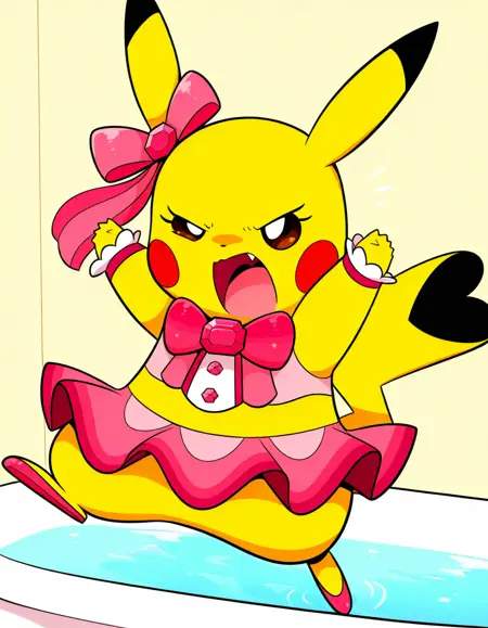 ポップスター: pikapop, pink ribbon, ear ribbon, pink skirt, pink shirt, sleeveless shirt, frilled cuffs, pink footwear, pink ribbon, bowtie, pink jewel, idol, midriff