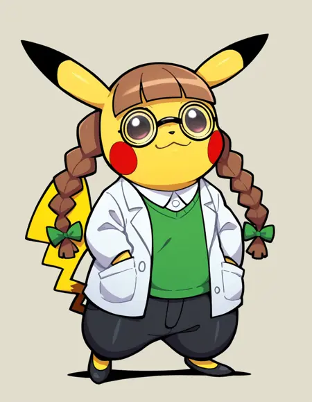 博士: pikaphd、实验服、有领衬衫、绿色毛衣、棕色头发、齐刘海、双辫子、黑色长裤、黑色鞋子、眼镜、圆形眼镜、口袋、啤酒瓶底眼镜、不透明眼镜、毕业帽