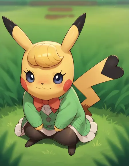 博士: pikaphd、实验服、有领衬衫、绿色毛衣、棕色头发、齐刘海、双辫子、黑色长裤、黑色鞋子、眼镜、圆形眼镜、口袋、啤酒瓶底眼镜、不透明眼镜、毕业帽