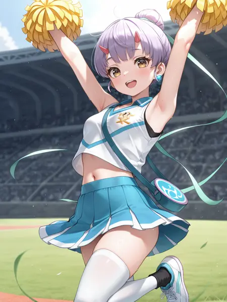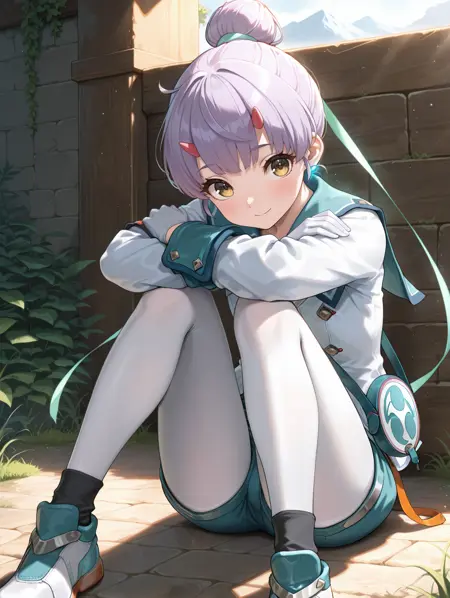 Tags (clothes): cyan single earring, hair ribbon, cyan sailor collar, white jacket, black undershirt, white gloves, tomoe bag, white pantyhose, cyan shorts, black socks, white sneakers,
