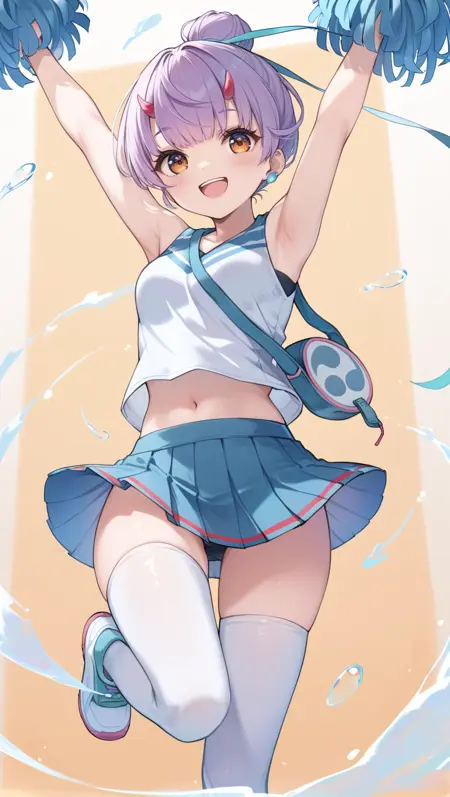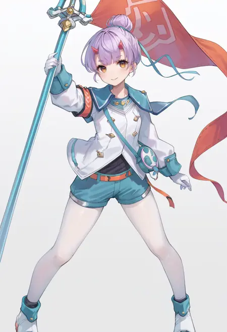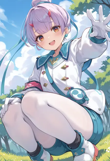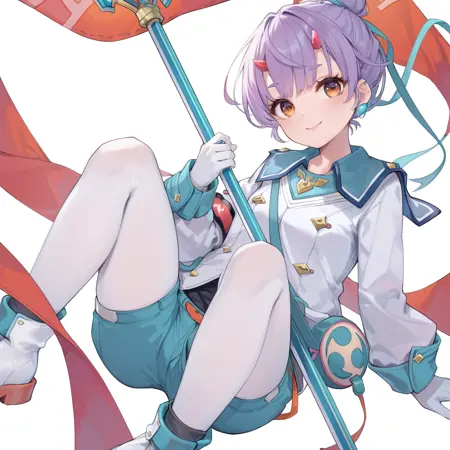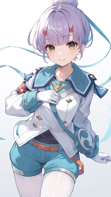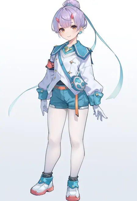 Tags (clothes): cyan single earring, hair ribbon, cyan sailor collar, white jacket, black undershirt, white gloves, tomoe bag, white pantyhose, cyan shorts, black socks, white sneakers,