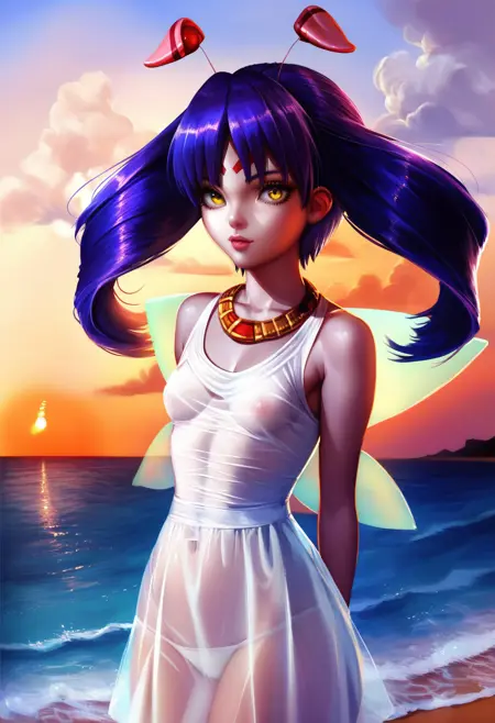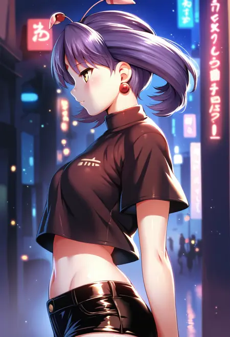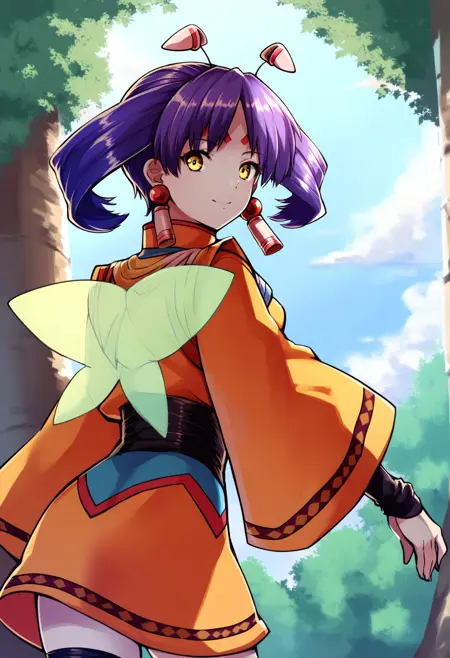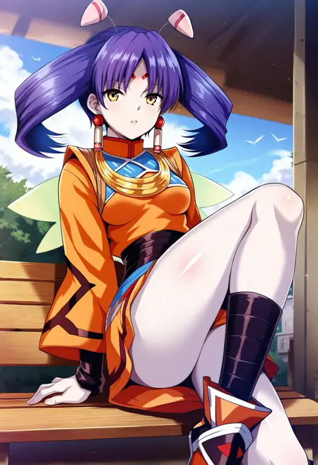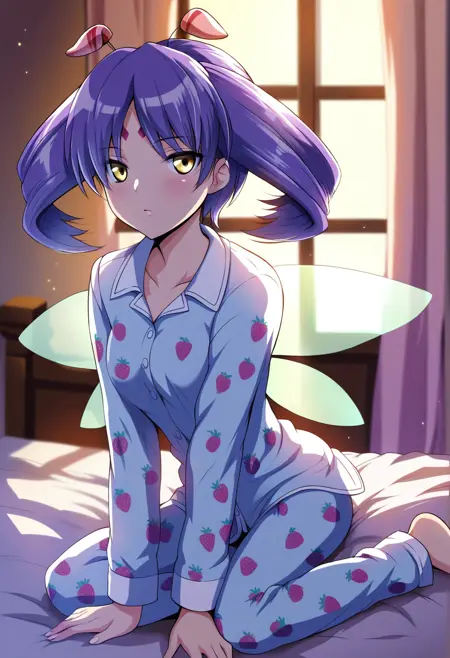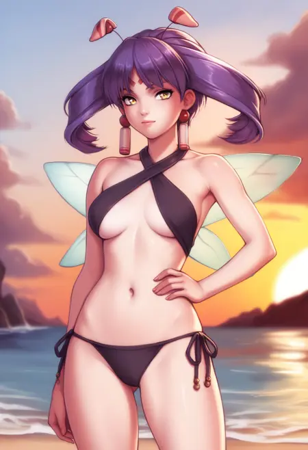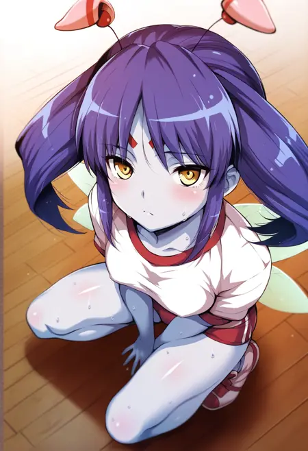 tio, facial mark, forehead mark, earrings, wings, antennae, purple hair, yellow eyes, twintails, grey skin