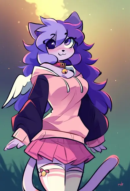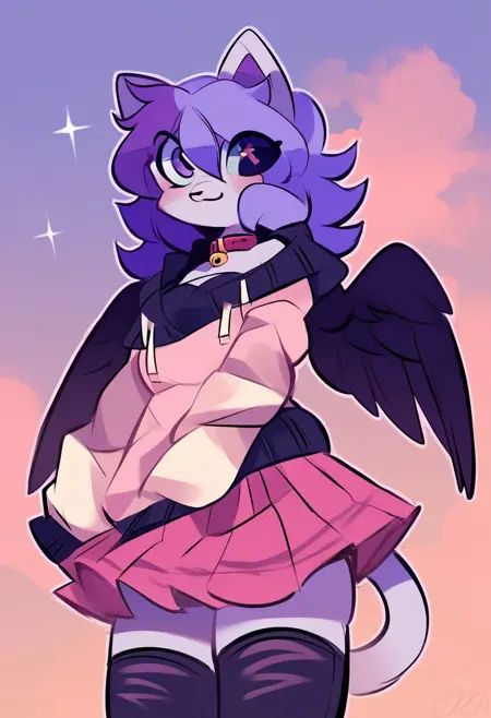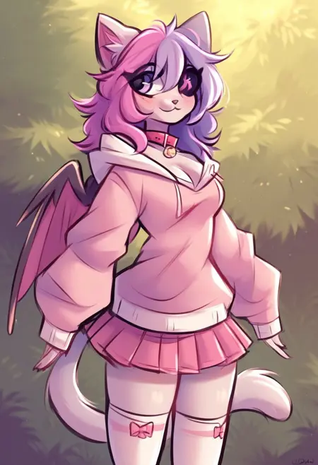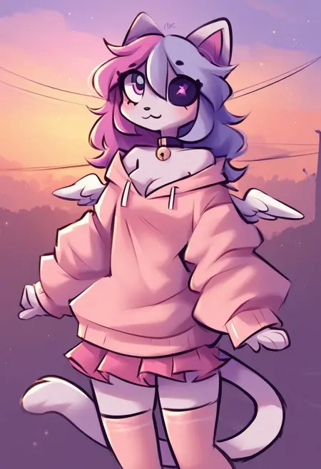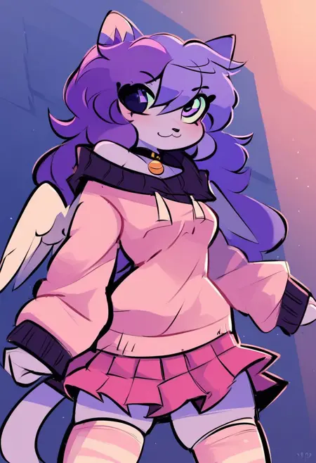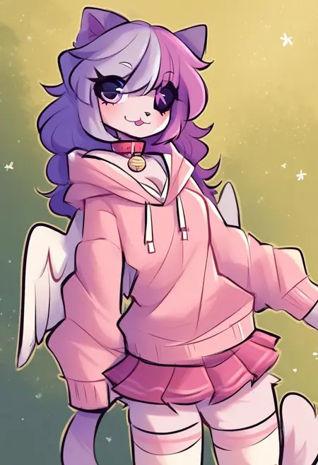 过膝袜,条纹过膝袜,条纹,翅膀,铃铛,肚脐,裙子,长袖,袖子超过手腕,颈圈铃铛,兜帽,连帽衫,项圈,衬衫,眼罩,袖子超过手指,迷你裙,毛衣,粉色裙子
