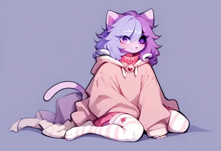 animals ears, long hair, purple hair, purple eyes, furry, cat tail, cat ears, cat girl, multicolored hair, eyes visible through hair, bangs