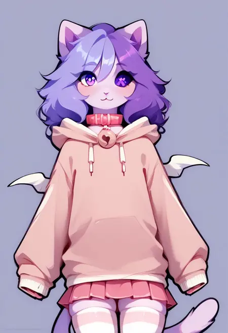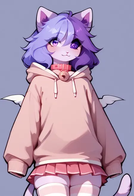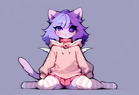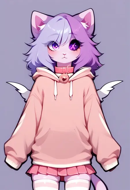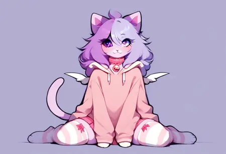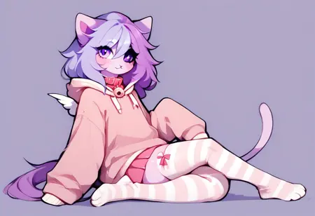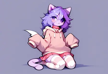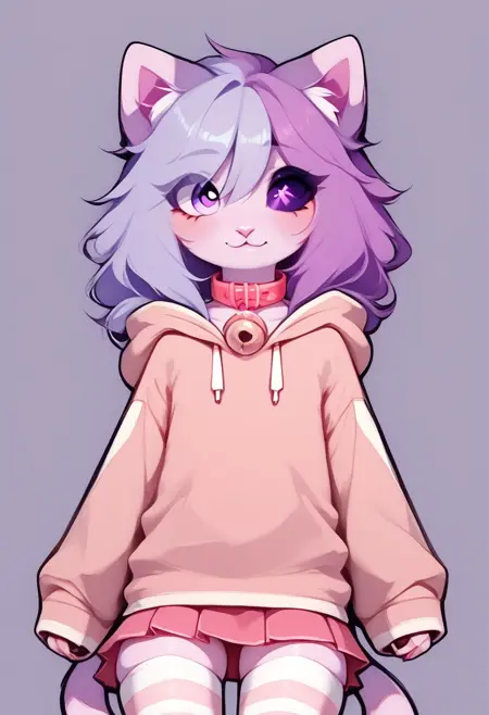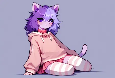 animals ears, long hair, purple hair, purple eyes, furry, cat tail, cat ears, cat girl, multicolored hair, eyes visible through hair, bangs