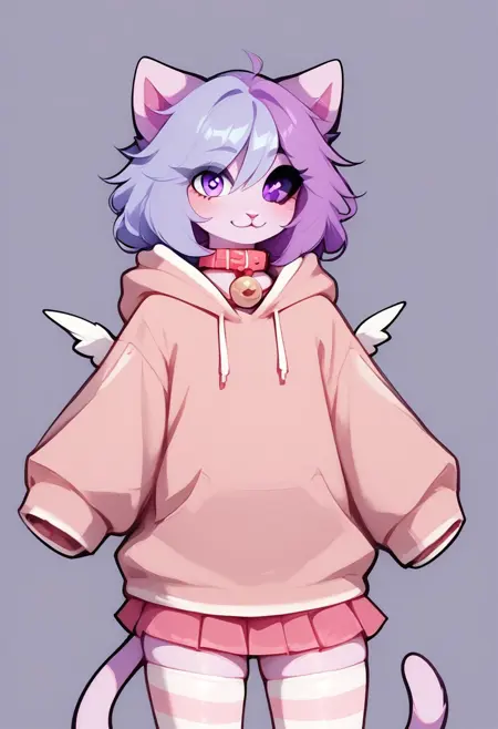 thighhighs, striped thighhighs, striped, wings, bell, navel, skirt, long sleeves, sleeves past wrists, neck bell, hood, hoodie, collar, shirt, eyepatch, sleeves past fingers, mini skirt, sweater, pink skirt