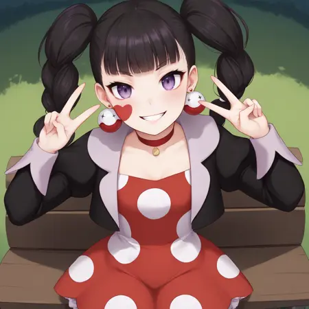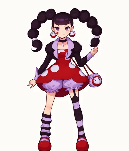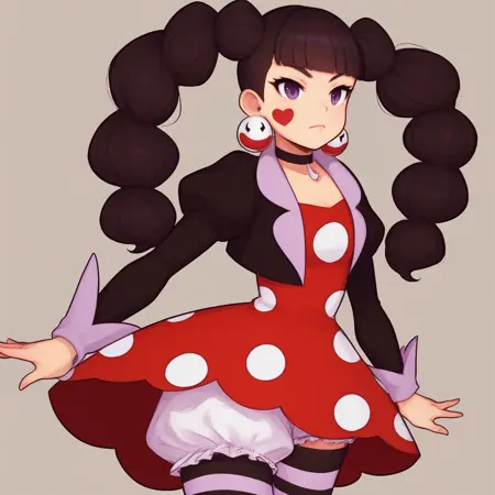 Illustrious 로라 이용 가능. 강도 1에서 작동합니다. 클로운 귀걸이가 일관되지 않게 생성되며, 드레스의 폴카닷 무늬도 불안정할 수 있습니다. 때로는 폴카닷이 매우 적게 생성되며, 그 중 일부는 하트 모양으로 나타날 수 있습니다(얼굴 무늬와의 프롬프트 침투 문제).