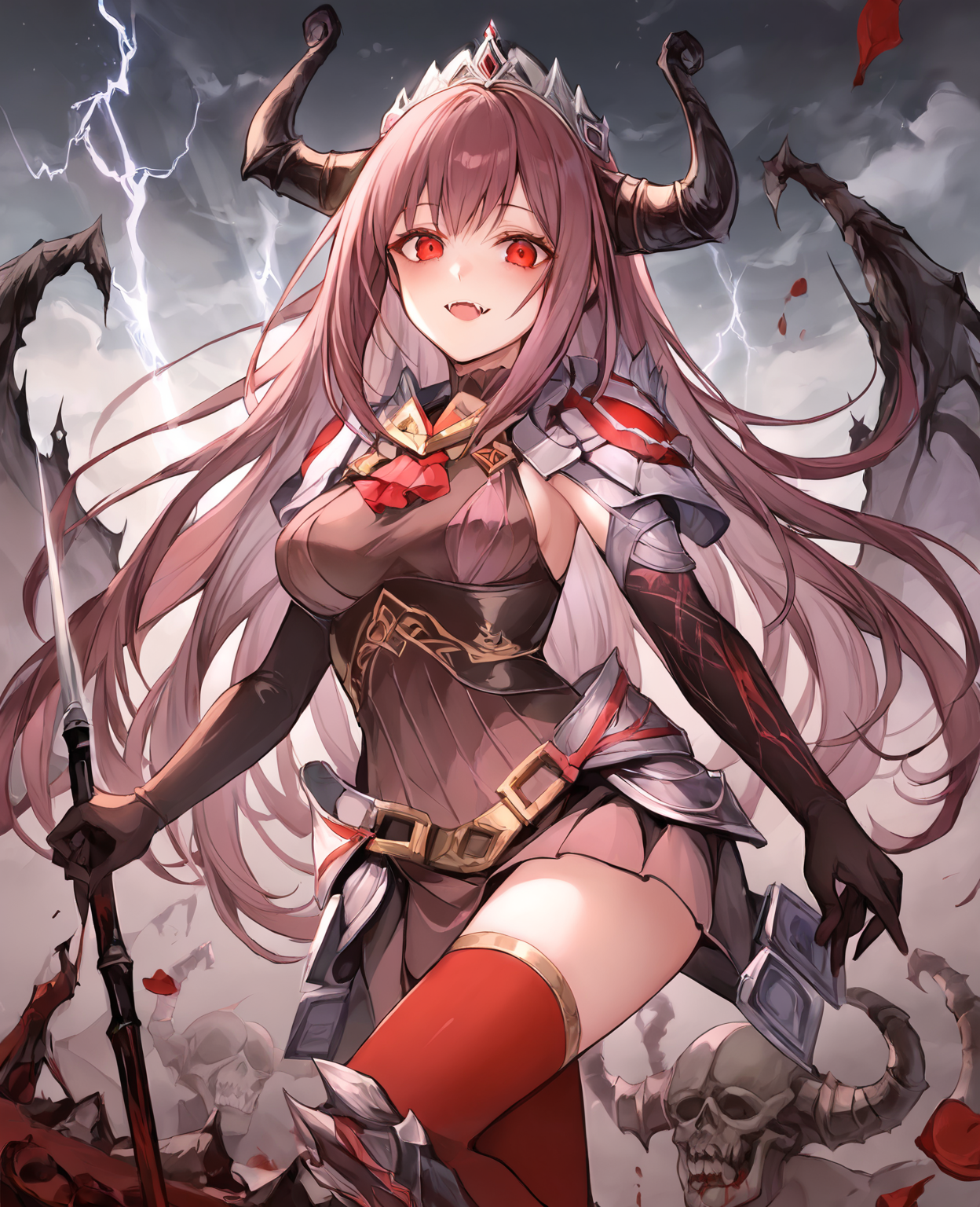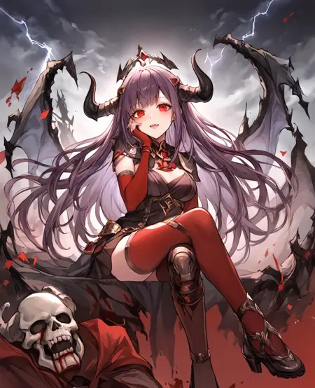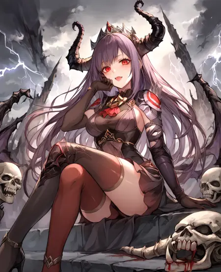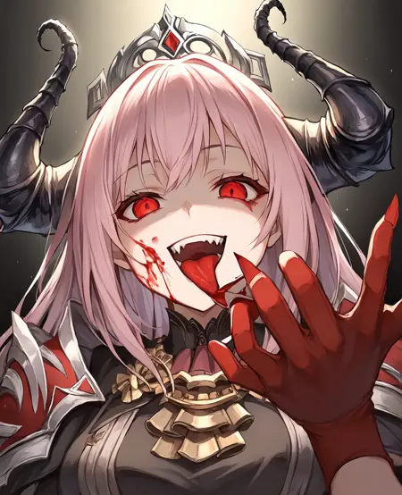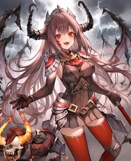 - Basic characteristic : Pink / purple / red long hair,horns,red eyes, ( fangs ) , wings ;