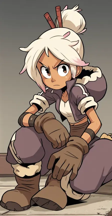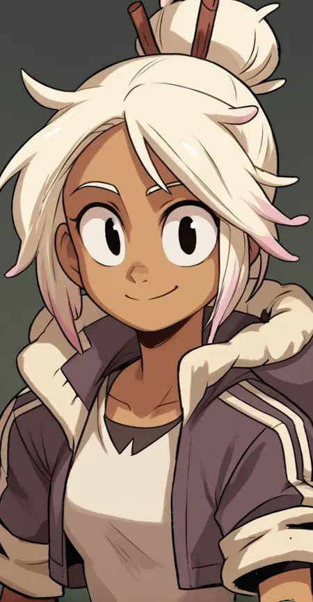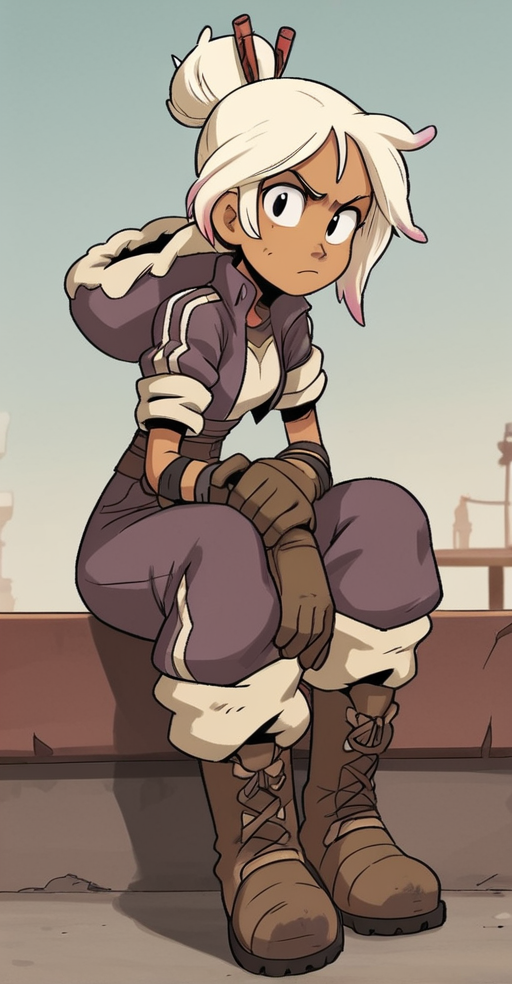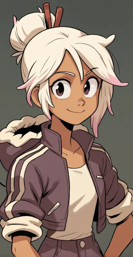 コミック『Tyson Hesse's Diesel: Ignition』のディース・ディーゼルのキャラクターロラ推奨タグ:score_9, 1girl, ブロンドヘア, 白髪, 多色髪, ヘアバニ, 髪止め, ジャケット, 茶色の手袋, 濃い肌, 濃い肌の女性,