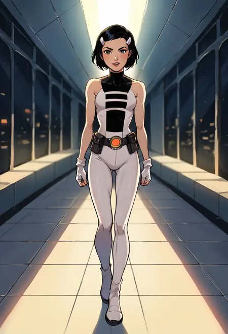 リバース版(短い髪、マントなしのジャンプスーツ):円形のベルト、白い髪クリップ、衣装3、白い指なし手袋、ミディアムボブ、