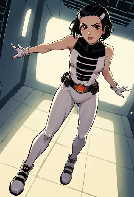 리버스(짧은 머리, 망토 없는 점프수트): 원형 벨트, 흰 머리클립, costume3, 흰 손가락 없는 장갑, 미디엄 밥,