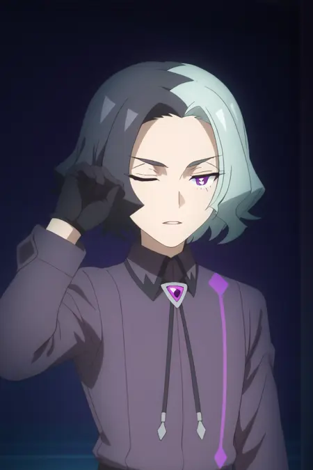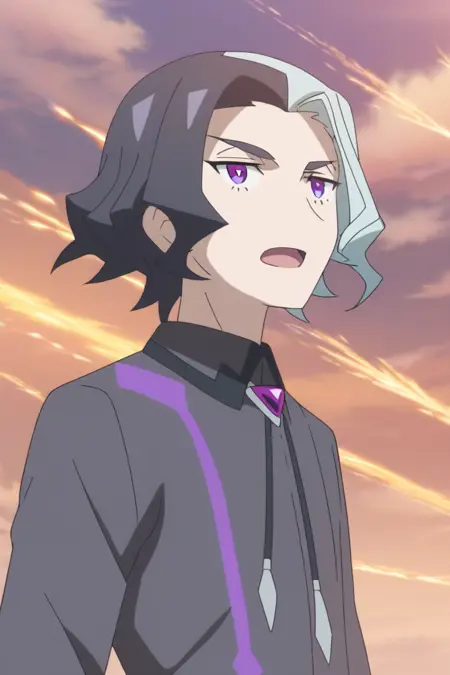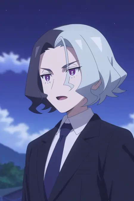 Amethio, two-tone hair, black hair, grey hair, purple eyes,