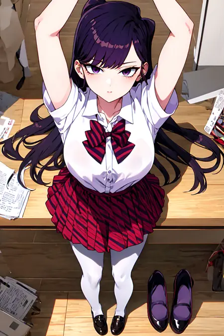 Outfit 2: KomisanUni2, komi shouko, 1girl, solo, long hair, black hair, purple hair, purple eyes, school uniform, white shirt, short sleeves, collared shirt, bowtie, red bow, striped bow, red skirt, shoes, black pantyhose,
