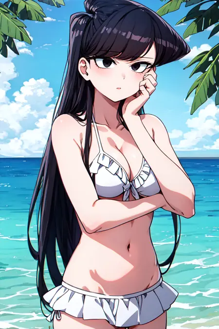 Outfit 4: Komisansw, komi shouko, 1girl, long hair, black hair, black eyes, swimsuit, white bikini, frilled bikini, bikini skirt, navel, cleavage, medium breasts,