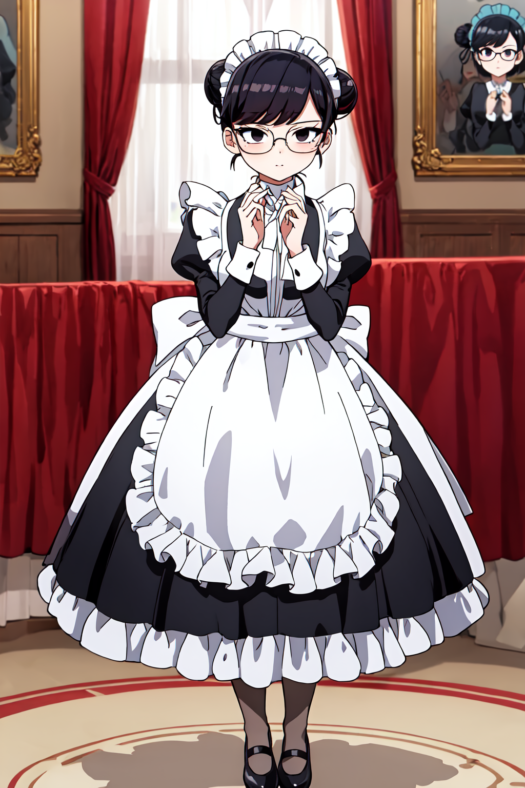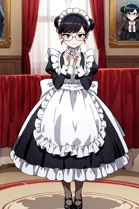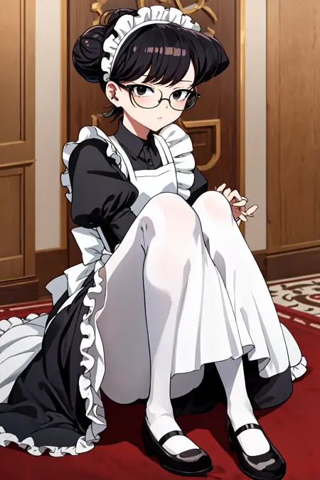 Outfit 5: KomisanMaid, komi shouko, 1girl, short hair, black hair, hair bun, black eyes, glasses, black dress, maid headdress, juliet sleeves, puffy sleeves, white apron, pantyhose, shoes,
