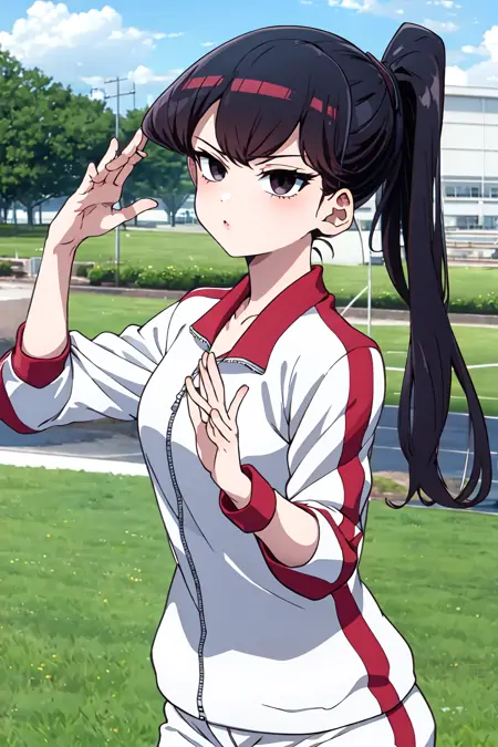 Outfit 3: Komisandep, komi shouko, 1girl, solo, long hair, ponytail, black hair, black eyes, white shirt, white jacket, track jacket, houshou (kancolle), white shorts,
